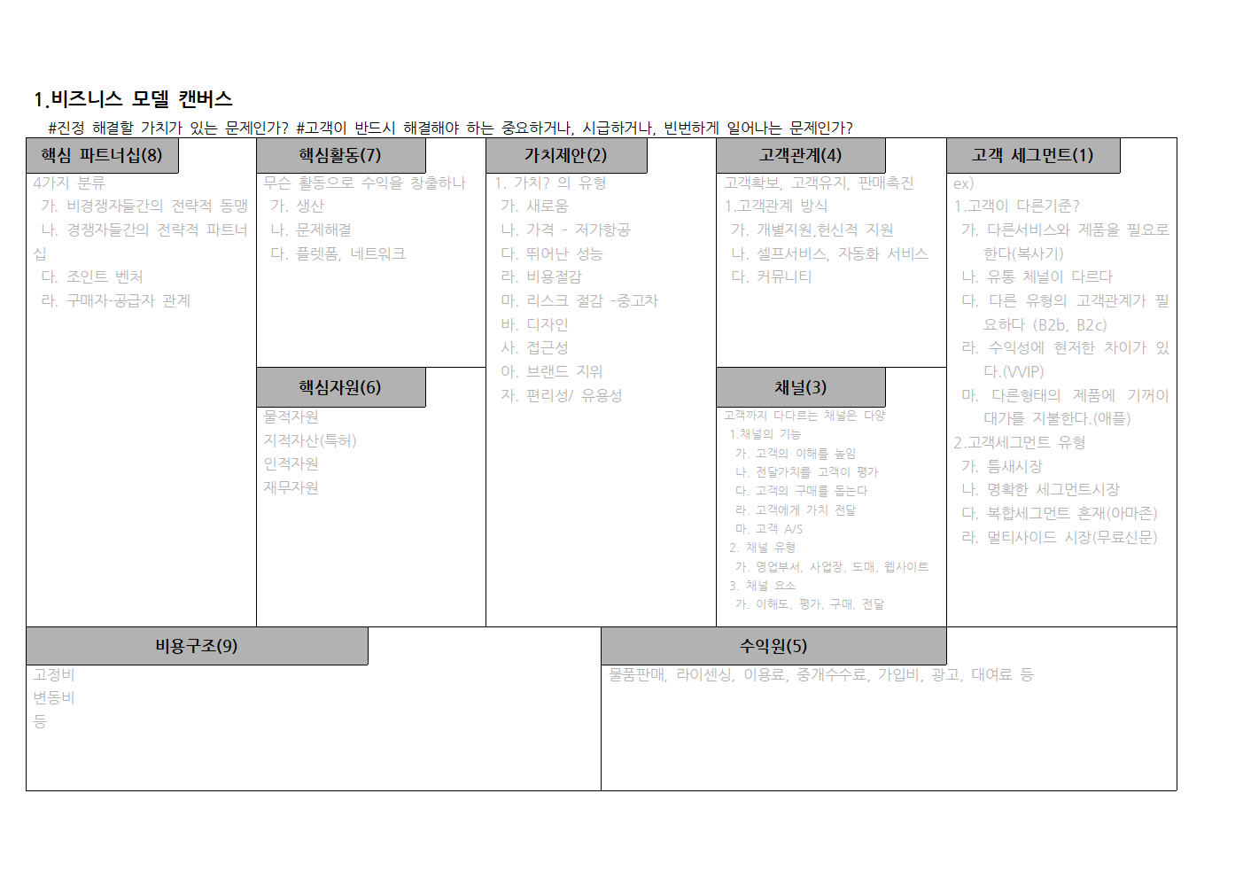 나인블록(비즈니스 모델 캔버스) 로 여러분의 아이템을 정리하여 수백번 빈칸을 채워 보시기 바랍니다.