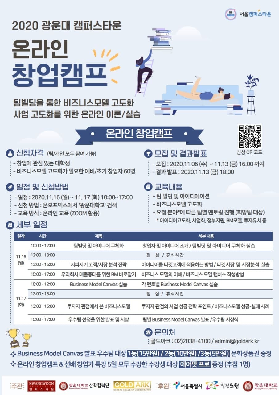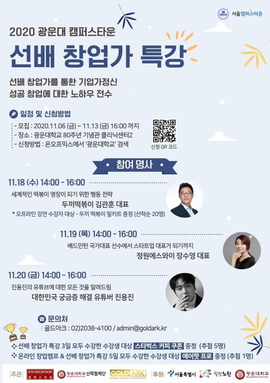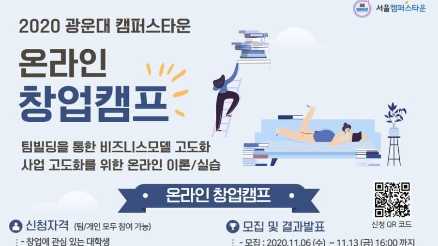 | [온라인][캠프]2020년 광운대 캠퍼스타운 온라인 창업캠프 모집 공고 (0) | 2020.11.12 |