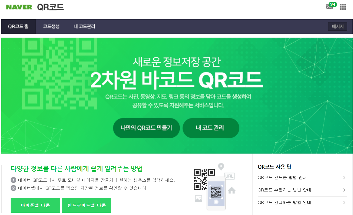 새로운 정보저장 공안 2차원 바코드 QR코드 QR코드는 사진, 동영상, 지도, 링크 등의 정보를 담아 코드를 생성하여 공유할 수 있도록 지원해주는 서비스입니다. 나만의 QR코드 만들기 내 코드 관리