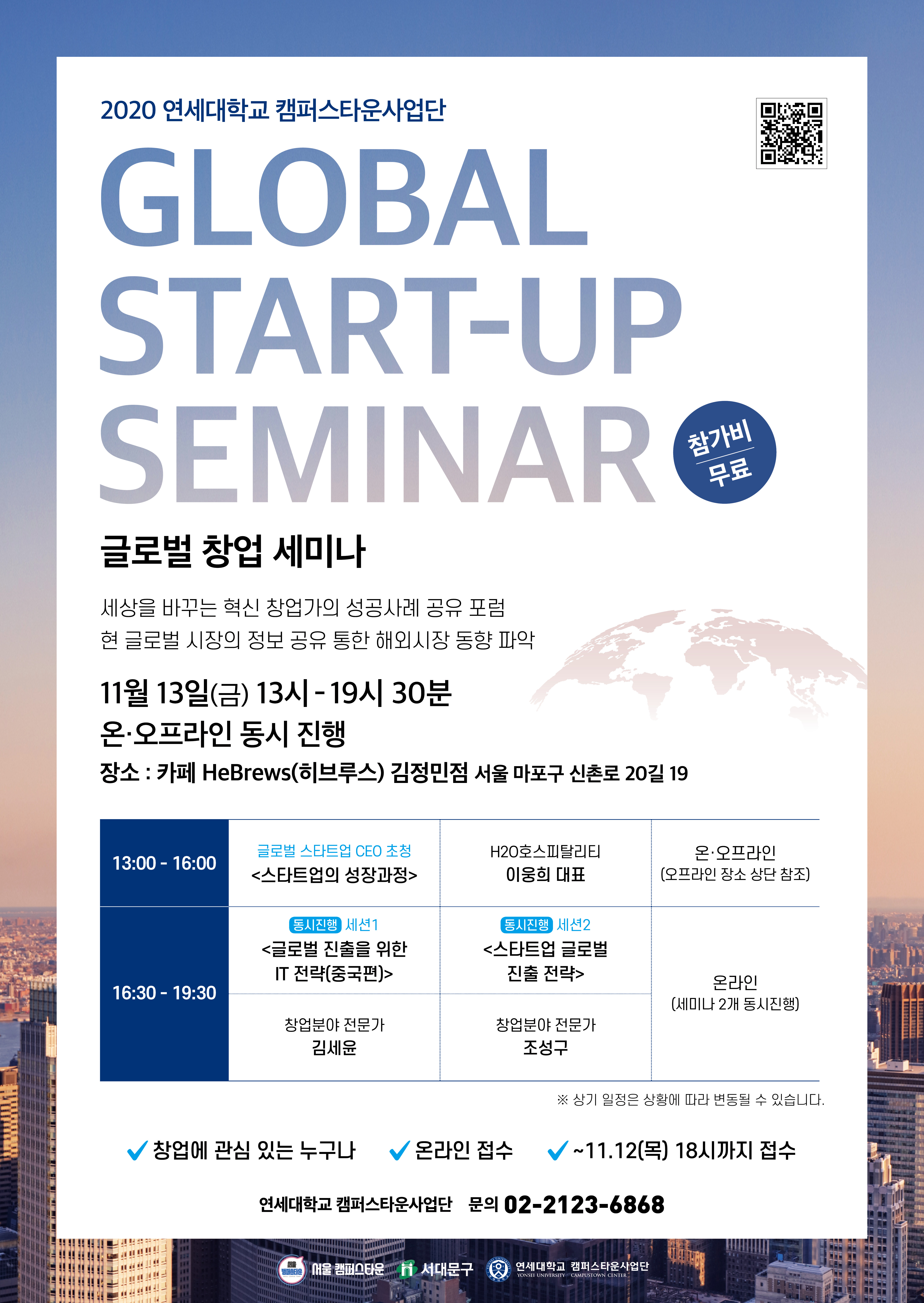 [출처] [연세대학교캠퍼스타운사업단] 2020 글로벌 창업세미나 참가자 모집(~11.12 18시까지) (스타트업 EX) | 작성자 연세대캠타