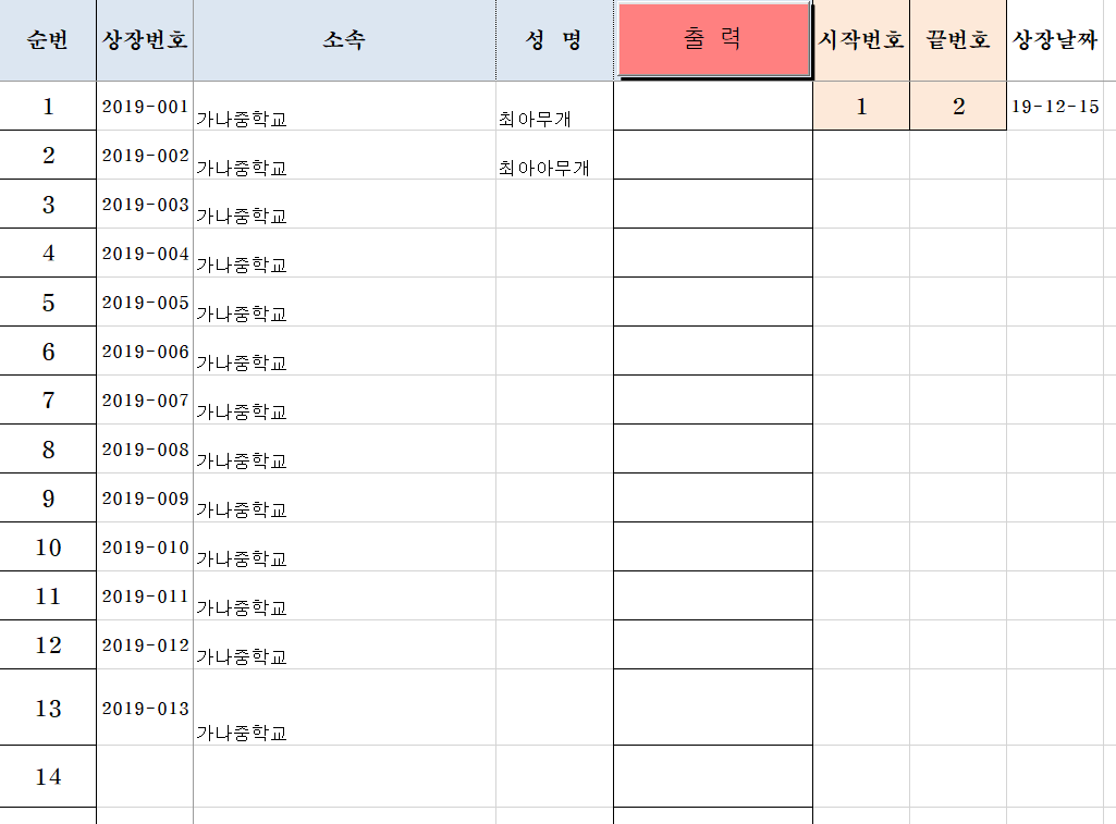 5)다 확인 후 첫번째 시트의 [출력] 버튼을 클릭하시면 끝번호까지 출력이 됩니다.