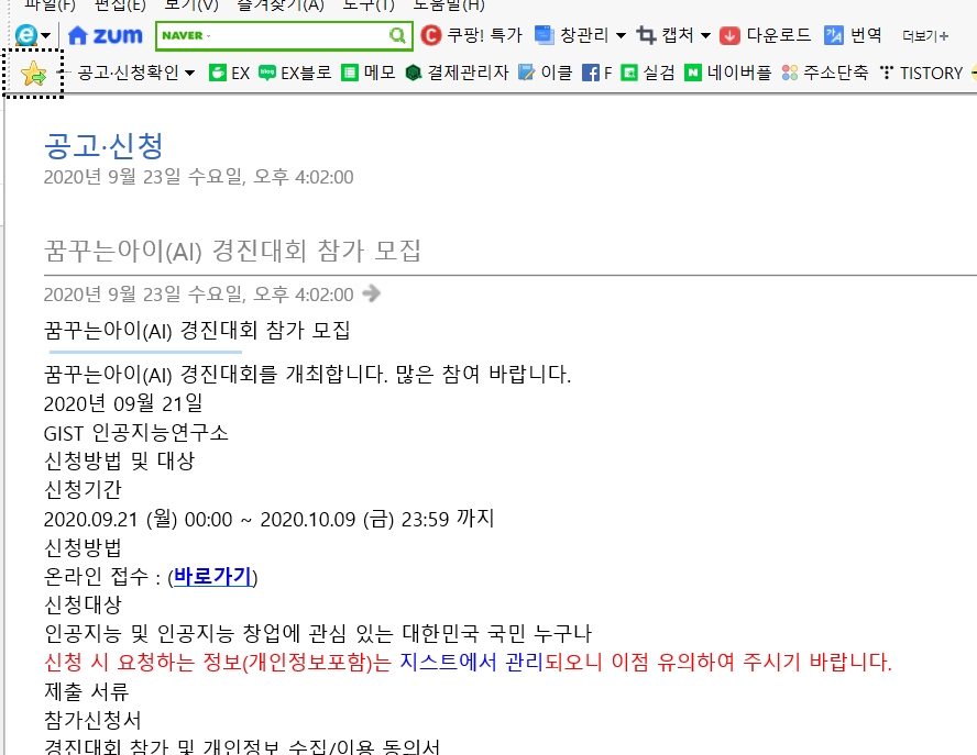익스플로어 즐겨찾기란에 [공고,신청확인] 버튼을 만드는 법을 알려드릴게요.