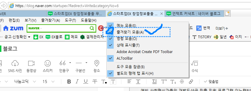 1. 익스플로어 [도움말(H)] 옆에 마우스 오른쪽 버튼 클릭 후 'a'클릭 -> 익플로어 하단 즐겨찾기버튼 생성