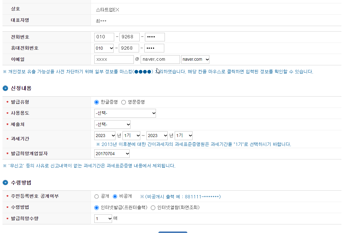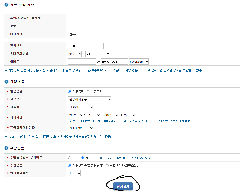 가급적 민증번호는 없이 발급하시고 [신청하기] 클릭 시