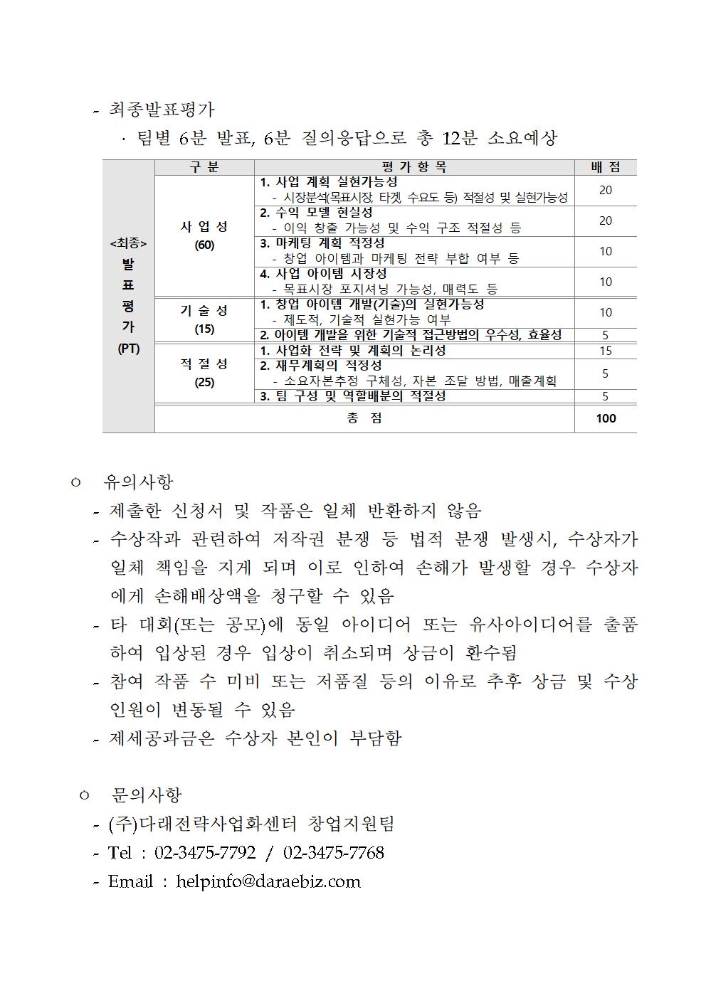 대상 1팀 200만원(사업화지원금 별도 400 만원) / 최우수상 2팀 150만원(사업화지원금 별도 300만원) / 우수상 3팀 각 100만원(사업화지원금 별도 200만원) / 장려상 4팀 각 50만원(사업화지원금 별도 100만원)